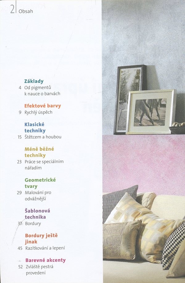 Prostřednictvím stručných návodů a instruktivních obrázků přibližuje knížka kreativní malířské techniky, které dokáží nápaditě vylepšit bytový interiér: např. malování strukturními barvami, které napodobují hrubozrnné štukové omítky, využití stíracích technik a tupování houbou, zábalové techniky, jež dávají stěně zajímavou strukturu (lze použít stočený bavlněný hadr, fólii nebo papír), vytváření geometrických obrazců a bordur, razítkování houbičkou či uplatnění plastických efektů.