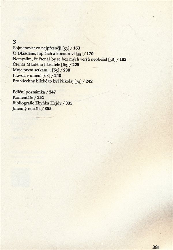 Svazek shrnuje nebásnické texty Zbyňka Hejdy (kritiky, proslovy, články o literatuře a literárním životě, dějinách, výtvarném umění apod.).