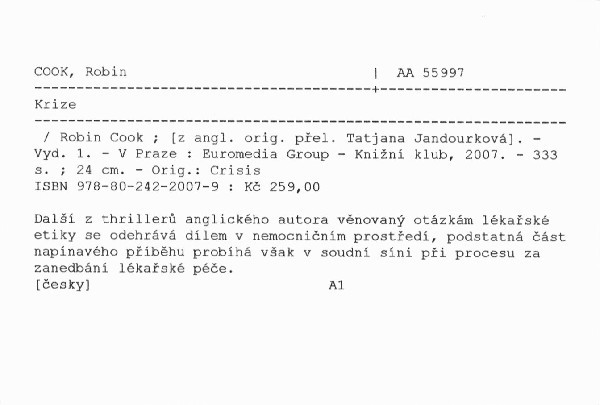 | Autor | Robin Cook ; [z angl. orig. přel. Tatjana Jandourková] |