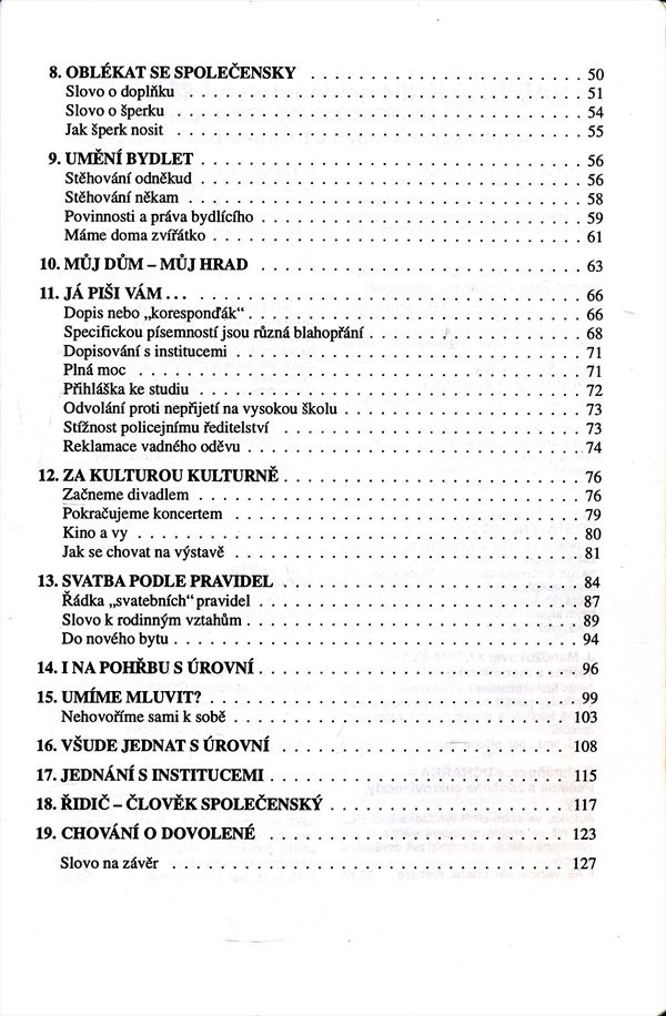 Seznamuje čtenáře s druhy pozdravů, způsobů podávání rukou i oslovení. Rozlišuje vhodné a nevhodné formy chování ve veřejných dopravních prostředcích, při návštěvách kulturních zařízení, institucí i v soukromí. Zaměřuje se i na takové společenské události jako je svatba nebo pohřeb. Zároveň pomáhá orientovat se v zásadách správného oblékání, stolování, korespondování či ústního projevu. 9.4.98 Dokl