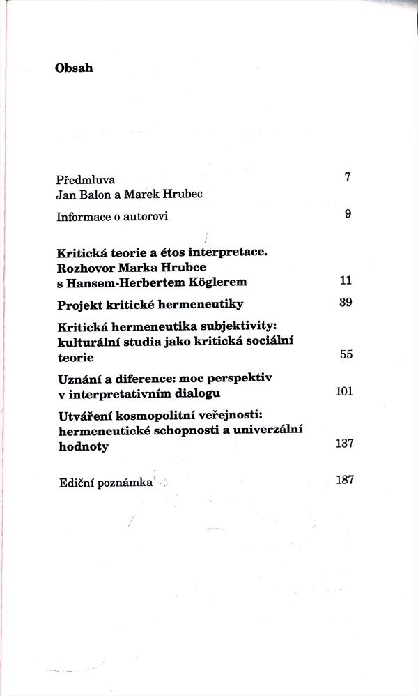 Úvod tvoří rozhovor s autorem, který má čtenáři přiblížit klíčová témata jeho ideové koncepce. První text definuje základy kritické hermeneutiky coby výklad předpokladů odhalování významu a obsahu - cílem je získat kritický a normativní náhled na interpretativní praxi. Druhý přibližuje podstatu výzkumných postupů, tzv. kulturních studií, coby pokračování každodenního reflexivního potenciálu a tím i dědice původního programu frankfurtské školy. "Uznání a diference" zkoumá možnosti adekvátně rozumět druhému, jež v sobě následně propojí dimenze uznání druhého. Závěrečný příspěvek vymezuje podstatu hermeneuticky založeného kosmopolitismu. Německý filozof prostřednictvím tzv. kritické hermeneutiky nahlíží na některé aktuální problémy současného světa.