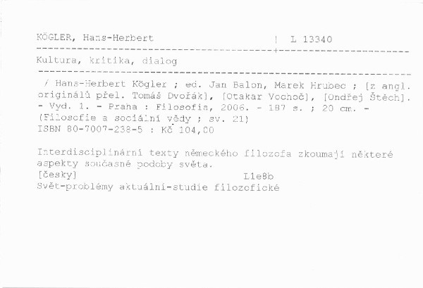 | Autor | Hans-Herbert Kögler ; ed. Jan Balon, Marek Hrubec ; [z angl. originálů přel. Tomáš Dvořák], [Ondřej Štěch], [Otakar Vochoč] |