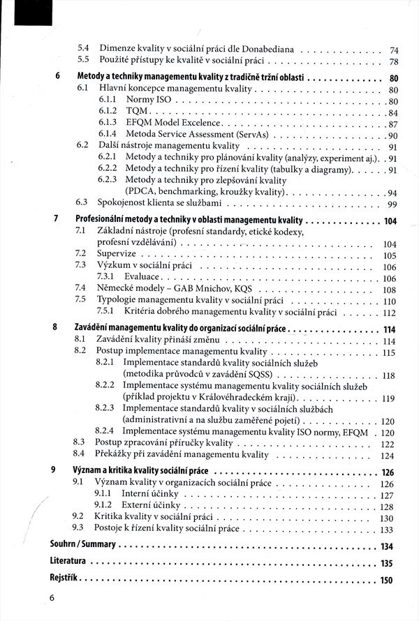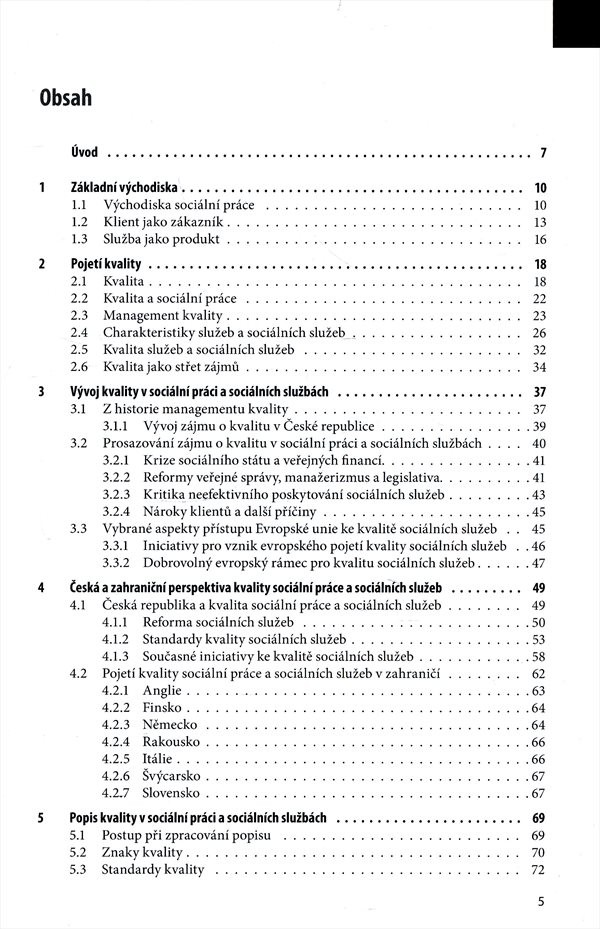Úvod přináší vymezení východiska sociální práce a sociálních služeb, objasnění základních pojmů a charakteristiku specifických vlastností sociálních služeb a jejich kvality. Jsou identifikovány některé z příčin přenosu zavádění problematiky kvality do organizací sociální práce, také je akcentován vliv Evropské unie a dalších iniciativ. Dále je uveden popis kvality a požadavků na kvalitu podle Donabediana spolu s nástroji kvality a dalšími technikami z tradičně podnikatelského prostředí. Text popisuje proces implementace managementu kvality a vybraných koncepcí, zmiňuje též možné přínosy a rizika aplikace managementu kvality v sociální práci a sociálních službách.