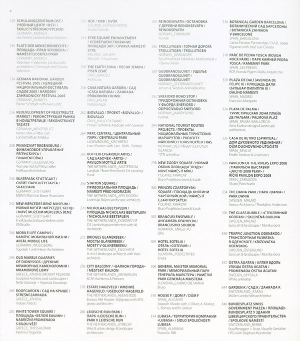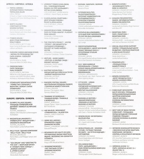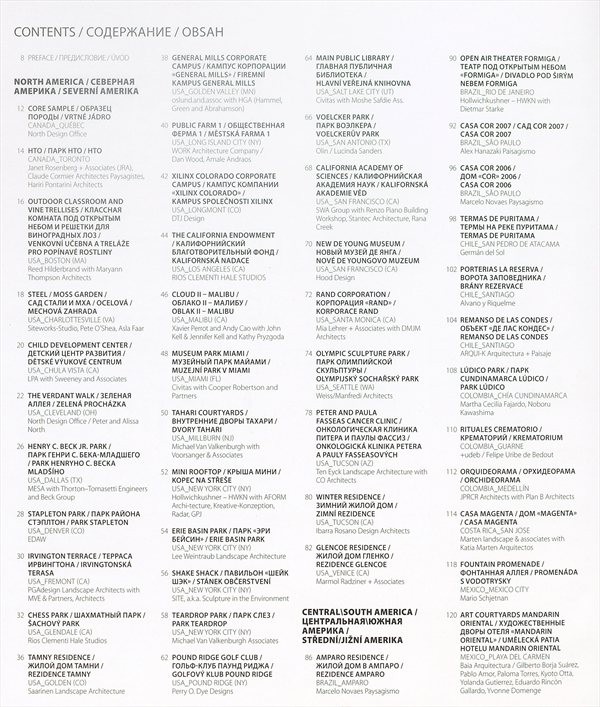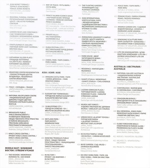 Rozsáhlá fotografická publikace přináší přehled tvorby současných krajinných architektů. Představuje krajinnou architekturu rozmanitého typu (zahrady, parky, úpravy veřejného prostoru i projekty velkého rozsahu) v různých částech světa.