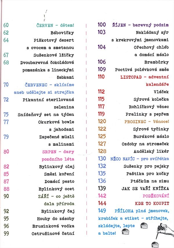 Stylistka a kuchařka Denisa Bartošová představuje svou knihu, jež je věnovaná nejen ženám, ale i mužům, dětem a dokonce i zvířátkům. Recepty jsou seřazené tematicky do kapitol, které odpovídají jednotlivým měsícům v roce. Kniha nabízí recepty na sladké i slané pečivo, kompoty, zavařeniny, likéry a nezapomíná i na recepty pro pejsky, kočičky a jiná zvířátka. Barevné fotografie doplňují velmi zdařile celou knihu. Přínosná je také kapitolka, která radí, kde se dají sehnat veškeré věci, jež byly v knize použity a závěrečná příloha, ve které jsou čtenářům nabídnuty předkreslené šablony, jimiž bylo jídlo nazdobeno.