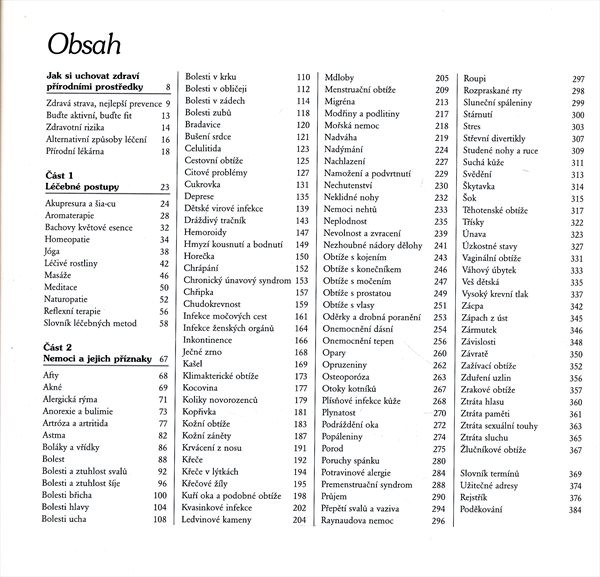 Informace o správném životním stylu, stravování; alternativní způsoby léčby, které se dají použít doma, jejich základní techniky; abecední přehled nemocí, možné příčiny a vhodná přírodní léčba k jejich odstranění.