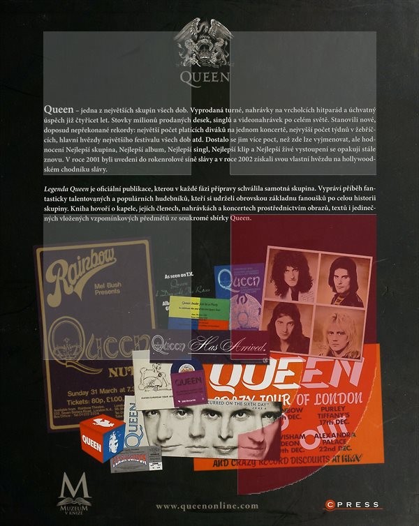 Další z řady tzv. "muzeí v knize", velmi oblíbeného formátu mezi skalními fanoušky, ilustruje oslnivou kariéru britské rockové skupiny Queen, která zářila na světové scéně v 70. a 80. letech 20. století. Vůdčí postavou a frontmanem kapely byl charismatický zpěvák Freddie Mercury, jehož smrtí v roce 1991 skupina Queen skončila. Za 20 let kariéry však po sobě zanechali mnoho hitů a jeden z největších fanouškovských kultů vůbec. Tato kniha je dalším náhledem do jejich odkazu. Kromě obrovského množství zajímavých fotografií se zde nabízí spousta tištěných replik všemožných queenovských memorabilií - obrázků, vstupenek na koncerty, rukopisů, korespondencí, plakátů a dalších a dalších. Fanoušci si tak mohou "pozůstalost" po své oblíbené kapele doslova osahat, je to jakási hmatatelná encyklopedie Queen.