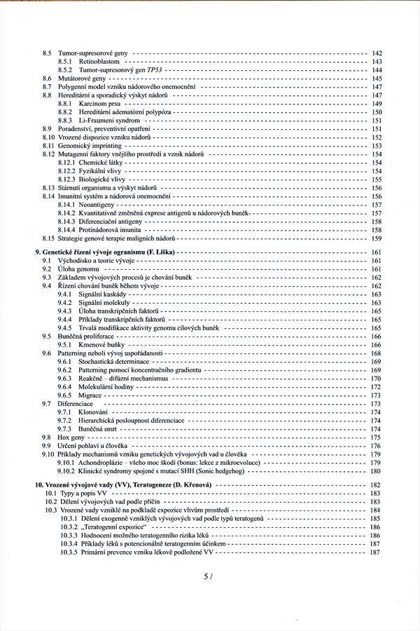 Druhý díl učebnice se zabývá vybranou problematikou molekulární genetiky, onkogenetiky, genetiky vývoje, vrozených vad a teratogeneze a interakce genů a prostředí.
