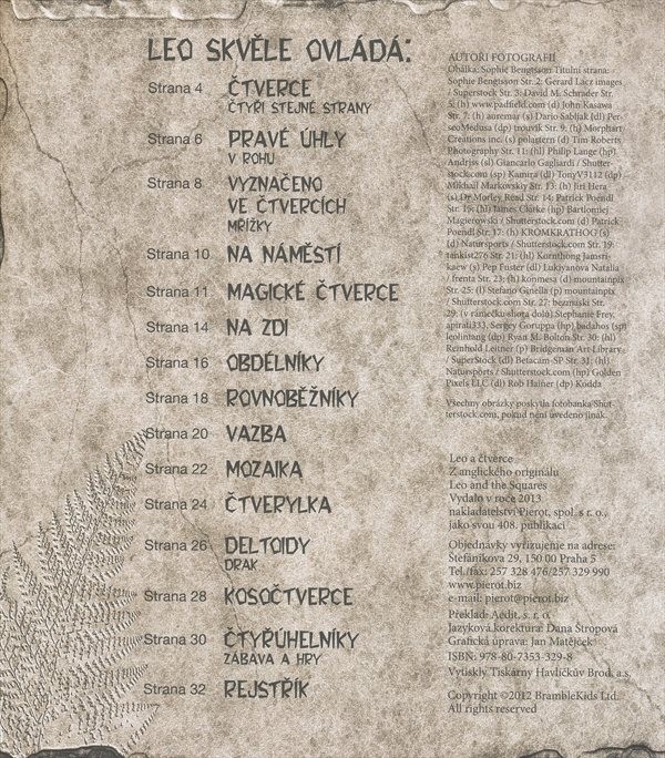 Leo je malý pravěký kluk, který rád pozoruje svět kolem sebe. Baví ho experimentovat s různými geometrickými tvary a rád zkouší, jak se dají využít v praktickém životě. V této publikaci se zaměří na linky, čáry a přímky, které svírají pravý úhel. Dokonalé čtverce a obdélníky lze najít nejen mezi věcmi, které vyrobil člověk, ale také v přírodě. Pojďme svět pravých úhlů prozkoumat společně s ním.