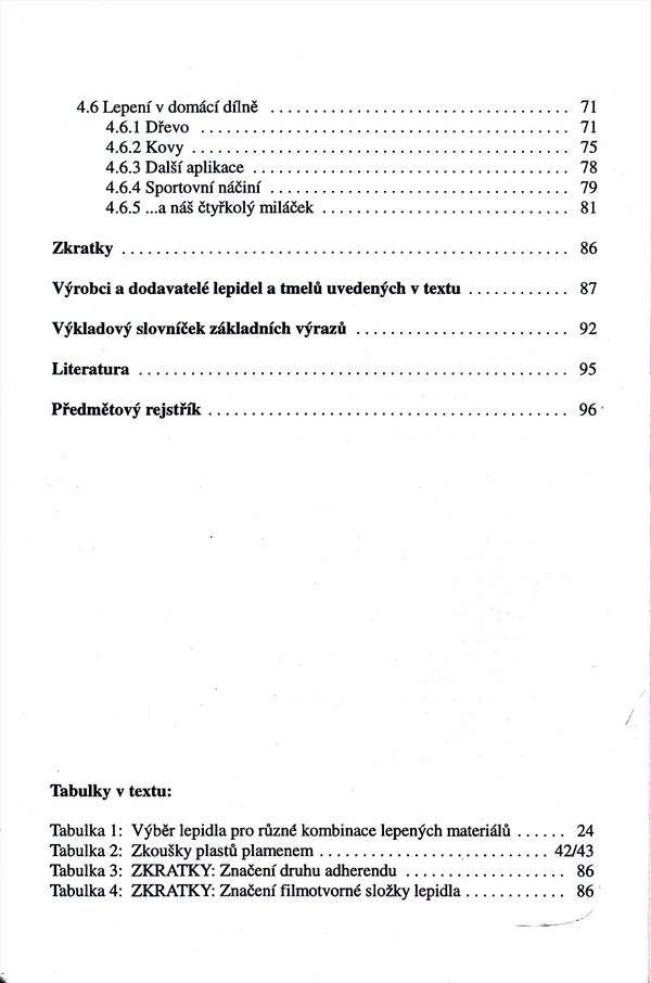 Kniha shrnuje informace o základních typech lepených spojů z hlediska namáhání spoje, o typech lepidel podle principu tuhnutí ve spoji, typech tmelů podle oblasti použití a způsobu tuhnutí a uvádí i druhy lepených materiálů (dřevo, kovy, plasty, sklo, pryže, kůže, porcelán, keramika) a výrobků (sportovní potřeby, hračky, zrcadla, nábytek, koberce). V závěru knihy je uveden seznam výrobců a dodavatelů lepidel a tmelů uvedených v textu, zkratky, výkladový slovníček výrazů a předmětový rejstřík.