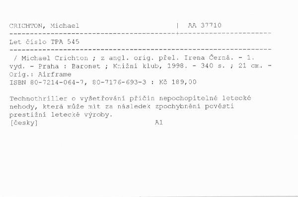 | Autor | Michael Crichton ; z angl. orig. přel. Irena Černá |