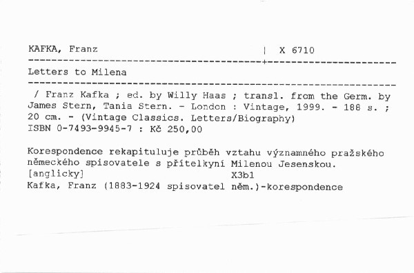 Korespondence rekapituluje průběh vztahu významného pražského německého spisovatele s přítelkyní Milenou Jesenskou.