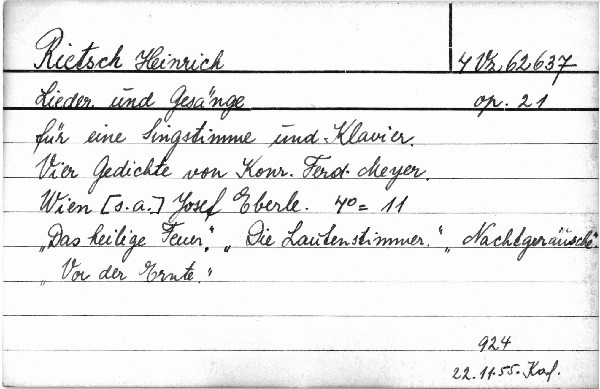 4 Gedichte von Konr. Ferd. Meyer. 1. Das heilige Feuer - 2. Die Lautenstimmer - 3. Nachtgeräusche - 4. Vor der Ernte.