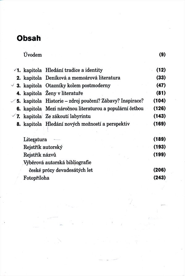 Komparativní metodou nás autor seznamuje se situací v české beletristické tvorbě posledních deseti let. V osmi kapitolách reflektuje tvorbu memoárovou, deníkovou, historickou, populární i tzv. ženskou literaturu. Kniha obsahuje pečlivě zpracovanou bibliografii jednotlivých autorů, fotografie, rejstříky a odkazy na recenze a kritiky uveřejněné v odborném tisku.