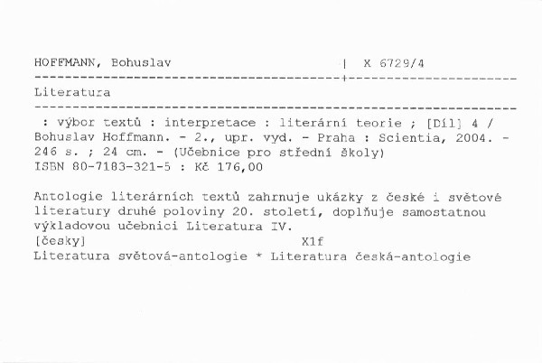 Antologie literárních textů zahrnuje ukázky z české i světové literatury druhé poloviny 20. století, doplňuje samostatnou výkladovou učebnici Literatura IV.