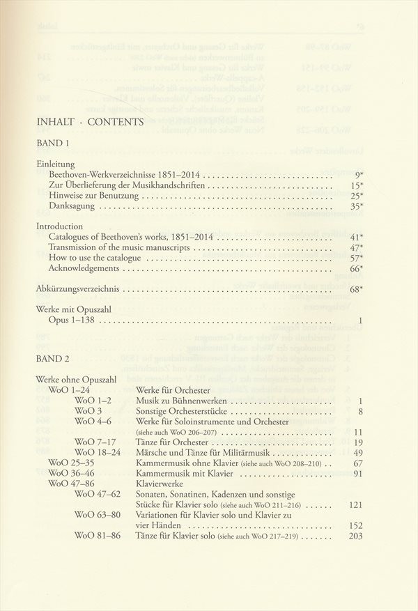 Obsáhle komentovaný tematický katalog Beethovenových dokončených či jen plánovaných a skicovaných děl reaguje na desetiletí beethovenovských výzkumů a nových interpretací, k nimž došlo od roku 1955. V onom roce vyšel v nakl. Henle prestižní Beethovenův Thematisch-Bibliographisches Verzeichnis seiner sämtlichen vollendeten Kompositionen, jenž po smrti původního autora Georga Kinského dokončil a vydal Hans Halm. Zevrubný popis vzniku skladby, popis pramenů, notové ukázky a odkazy na literaturu jsou součástí všech původních číslovaných opusů i skladeb dochovaných bez původního opusového čísla. K orientaci v díle napomáhají další doplňkové seznamy: např. seznam skladeb podle druhů a žánrů nebo podle doby vzniku, chronologie podle prvého uveřejnění děl (do roku 1830) a pomocný seznam nakladatelů, časopisů a novin, v nichž byl uveden, dále seznam autorů textových předloh, seznam titulů a samotných textů a pod. Obsáhlá bibliografie a jmenný rejstřík v závěru publikace.