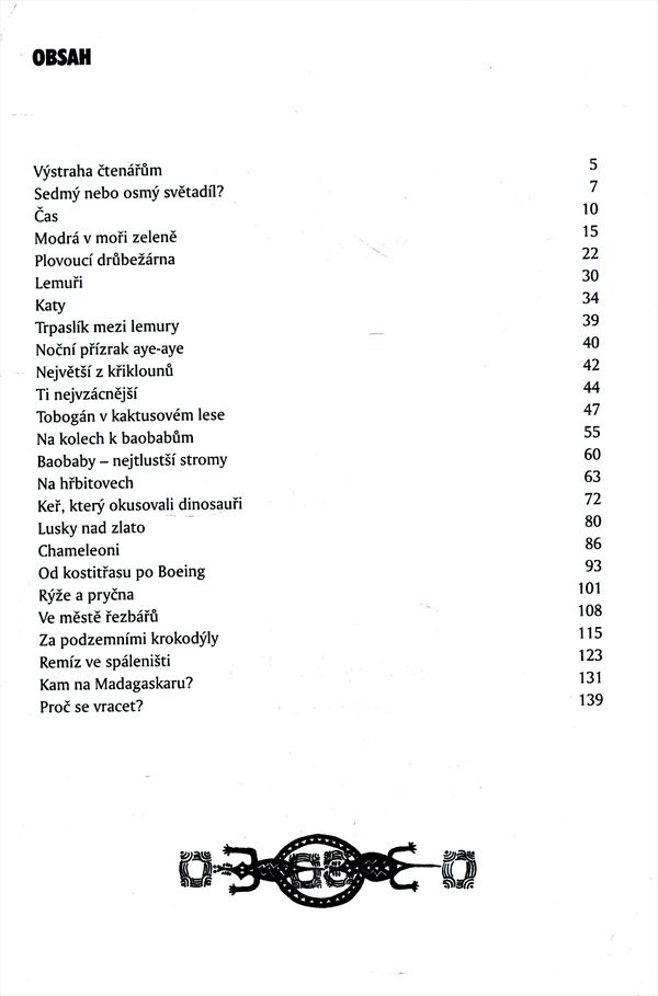 Jak autor popisuje, na Madagaskar se jezdí za jedinečnou přírodou. Většina zvířat, která zde žijí a rostlin, které se zde vyskytují, nemají domov nikde jinde. Historické stavby a architektonické skvosty zde nejsou a koupání v moři je nebezpečné pro vysoký výskyt žraloků. Zajímavé putování po ostrově doplňuje množství barevných i černobílých fotografií a několik praktických informací a rad pro turisty.