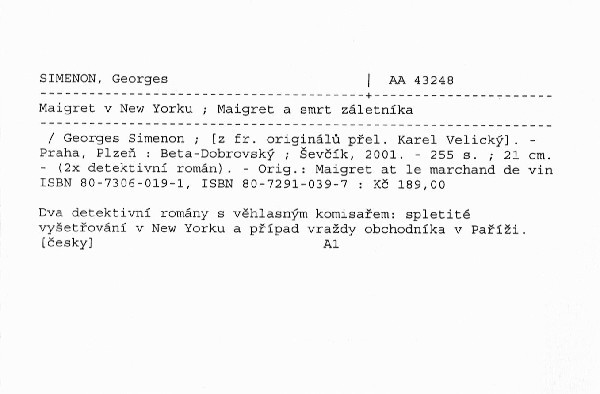 Dva detektivní romány s věhlasným komisařem řeší spletité vyšetřování v New Yorku a případ vraždy obchodníka v Paříži.