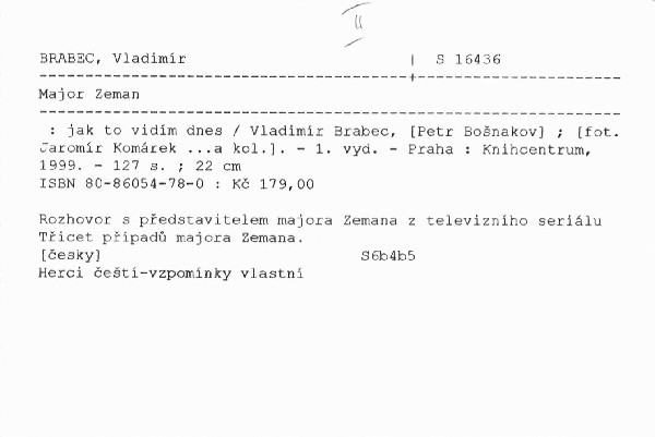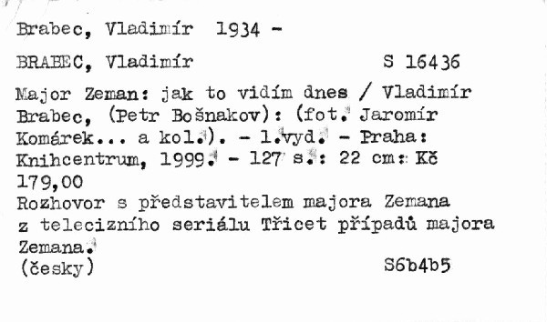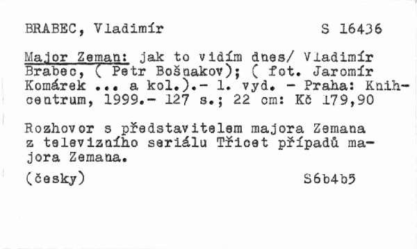 Vladimír Brabec jako představitel majora Zemana odpovídá na otázky Petra Bošnakova. Cílem rozhovorů je snaha reagovat na "causu Zeman", která se objevila v souvislosti se znovuuvedením televizního seriálu Třicet případů majora Zemana. Jednotlivé rozhovory oddělují vstupy herců, kteří se na vzniku seriálu rovněž podíleli - Ivany Andrlové, Renaty Doleželové, Jaroslavy Obermeierové, Radoslava Brzobohatého, Rudolfa Jelínka a Petra Štěpánka. Publikace postrádá faktografické vybavení - soupis tvůrců jednotlivých dílů, zejména scénáristů.