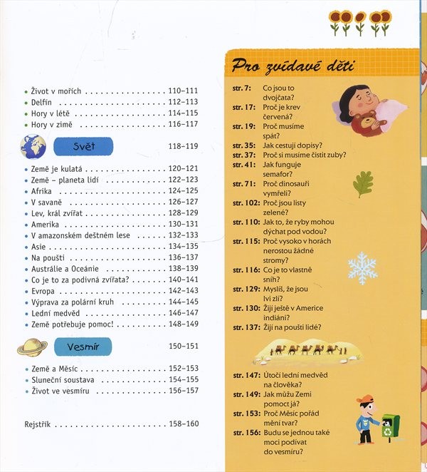 Kniha s nápaditou grafickou úpravou pomůže dospělým nalézt odpovědi na mnoho zvídavých dětských otázek ze světa kolem nich. Moderní ilustrace doprovázející text jsou přizpůsobeny věku čtenářů. Kniha je rozdělena do několika přehledných kapitol a na začátku každé z nich je rozkládací obrázek, který přiblíží jednotlivá témata. Text doplňují jednoduché otázky.