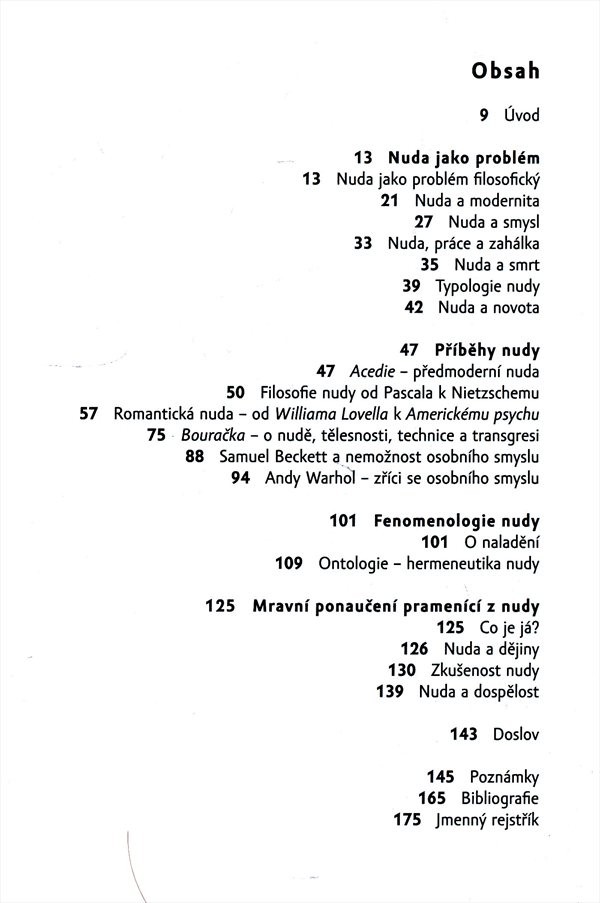 Kniha je rozdělena do čtyř částí: první část obsahuje různé aspekty nudy, druhá část je věnována příběhům nudy a její vztahy k modenitě, část třetí je zaměřena na fenomenologická zkoumání nudy v díle M. Heideggera a poslední část se zabývá problémy, jak se má člověk stavět k nudě a jak by se k ní naopak stavět neměl. Text je doplněn poznámkovým aparátem.