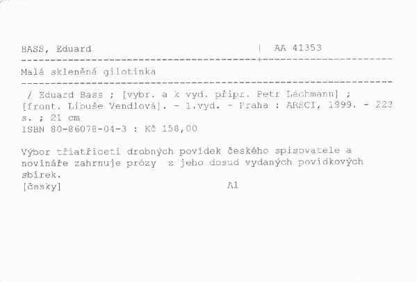 Autor | Eduard Bass ; [front. Libuše Vendlová] ; [vybr. a k vyd. připr. Petr Lachmann] |