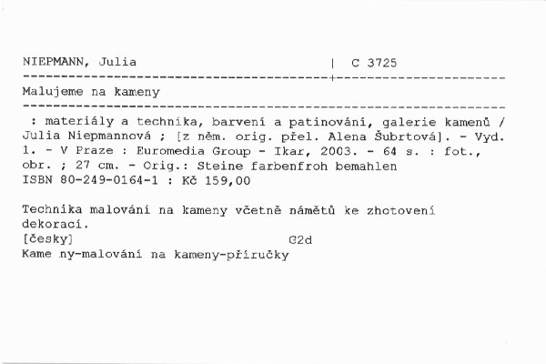 Příručka radí jak vybrat vhodný kámen pro určitý motiv, jaké barvy, štětce, tužky a další pomůcky jsou potřeba ke zhotovení malovaných kamenů. Podrobně popisuje pracovní postup. Součástí knihy jsou předlohy kreseb, podle kterých můžeme zhotovit originální dárky (těžítko, jmenovku, ozdobu do kuchyně).