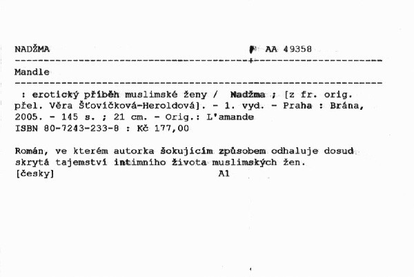 | Autor | Nadžma ; [z fr. orig. přel. Věra Šťovíčková-Heroldová] |