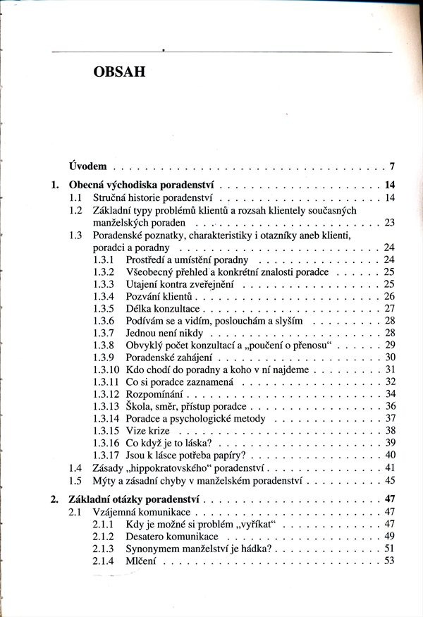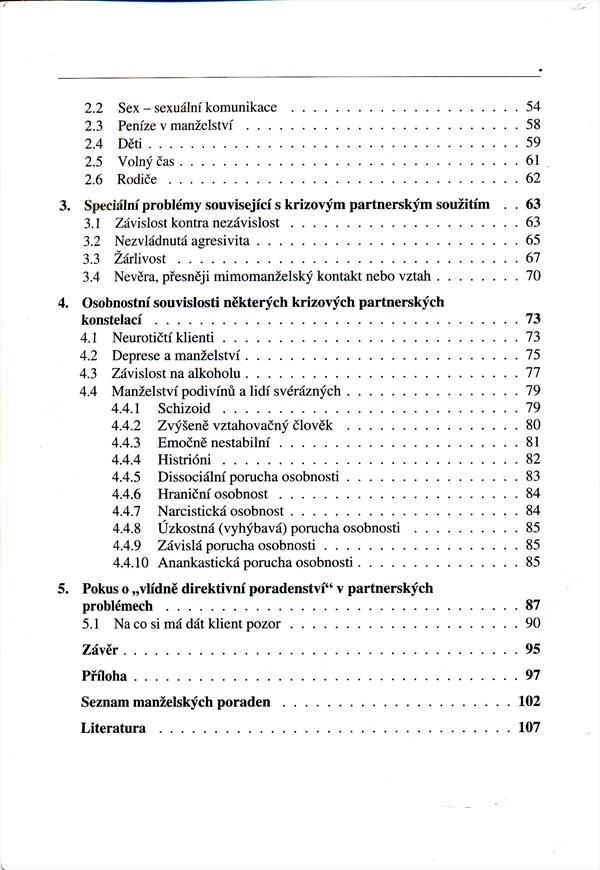 Renomovaný poradenský psycholog navrhuje v praxi fungující východiska z manželských krizí a neshod. Jde především o to, naučit se přiměřeným reakcím i jasné, asertivní komunikaci v páru i mezi všemi členy rodiny. Text se nejprve zabývá historií, technikou a taktikou poradenství včetně jeho zásad, z nichž nejdůležitější je dle autora: "Především neškodit". Další část vymezuje problémy manželského soužití a zaměřuje se zejména na možný manželský konflikt a jeho řešení v podmínkách omezeného časového prostoru. Mimořádnými, ale pro většinu krizových situací typickými událostmi, charakteristikou osob vyvolávajících konflikty a návodem "vlídně direktivního poradenství" se zabývá poslední třetina knihy. Nechybí dotazník poradenských problémů a seznam manželských poraden na území ČR.