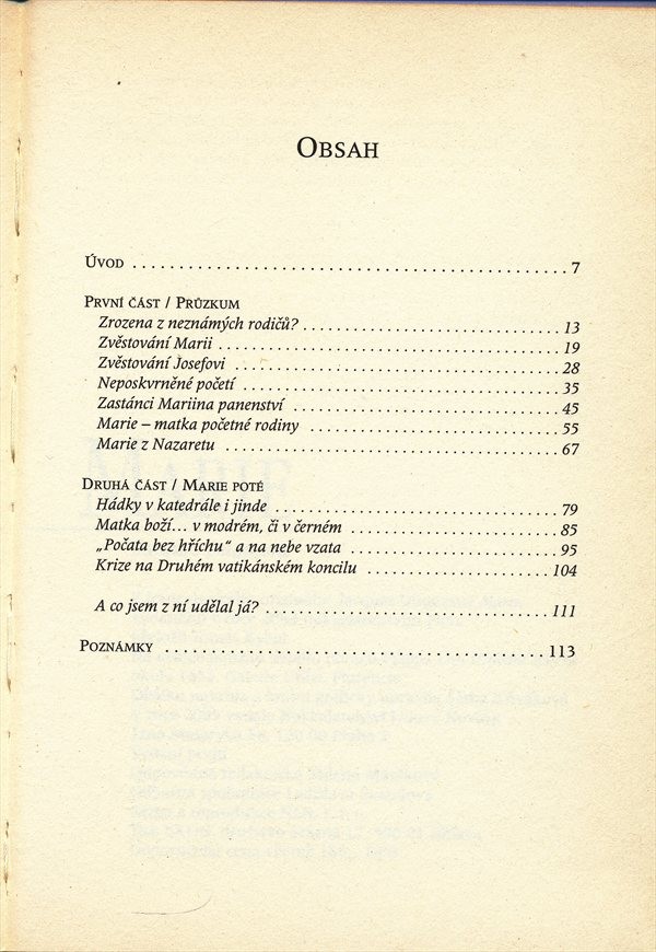 Kniha zkoumá tajemství Mariina života a pátrá po Marii reálné a historické i po té, kterou vzývají věřící.