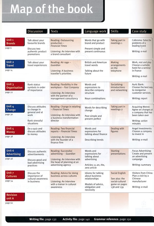 Učebnice obsahuje celkem 14 lekcí a dvě opakovací lekce. Každá lekce obsahuje článek, slovní zásobu, poslech, stručný výklad mluvnice a případové studie. Součástí učebnice jsou rovněž 3 audio CD. V závěru najdeme stručný přehled gramatiky.