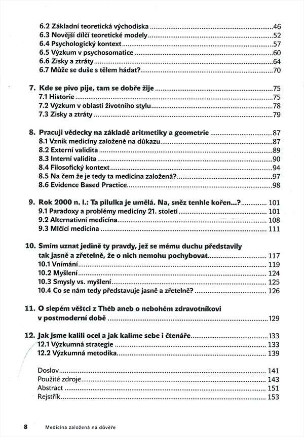 Publikace se věnuje historickému kontextu, jazykovým pastem, psychosomatickým teoriím, preventivní medicíně, způsobům poznání a poznávání v kontextu postmoderní filozofie, metodologii výzkumu, stavu současné medicíny.