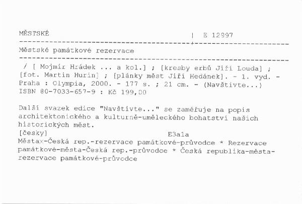 Čtyřicet českých, moravských a slezských historických měst bylo vzhledem k bohatství a mimořádnému významu architektonických a kulturně-uměleckých památek vyhlášeno městskými památkovými rezervacemi. Publikace, jež má inspirovat k návštěvě těchto "historických perel" českých zemí, přináší stručný popis historie města, popis nejvýznamnějších památek i otvírací doby muzeí, galerií a památkových objektů. Textovou část doplňují barevné fotografie a plánky jednotlivých historických center.