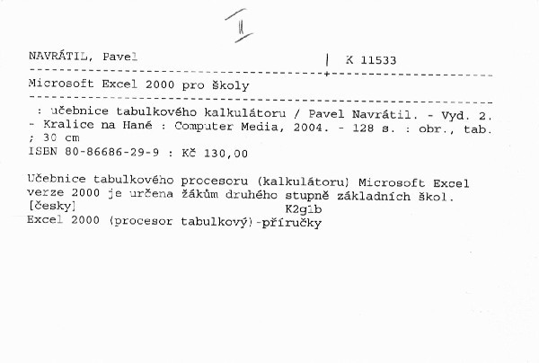 Učebnice tabulkového procesoru (kalkulátoru) Microsoft Excel verze 2000 je určena žákům druhého stupně základních škol.