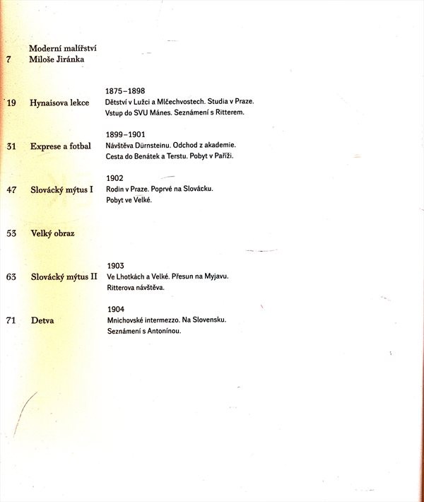 Monografie, která vyšla u příležitosti stejnojmenné výstavy v Chebu a Roudnici n. Labem, představuje Miloše Jiránka jako jednu ze zakladatelských postav české moderní malby přelomu 19. a 20. století.