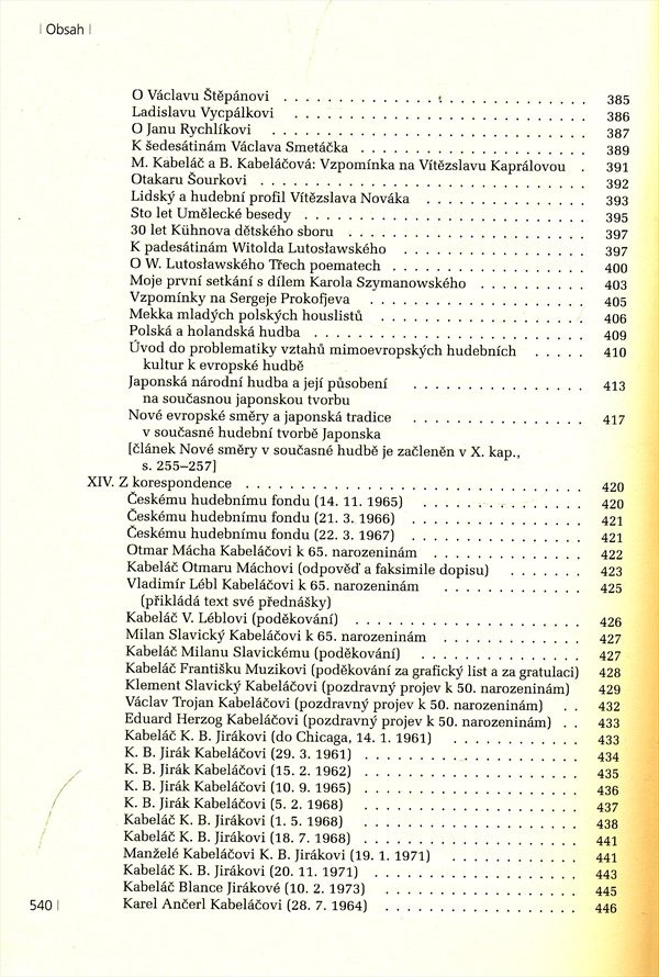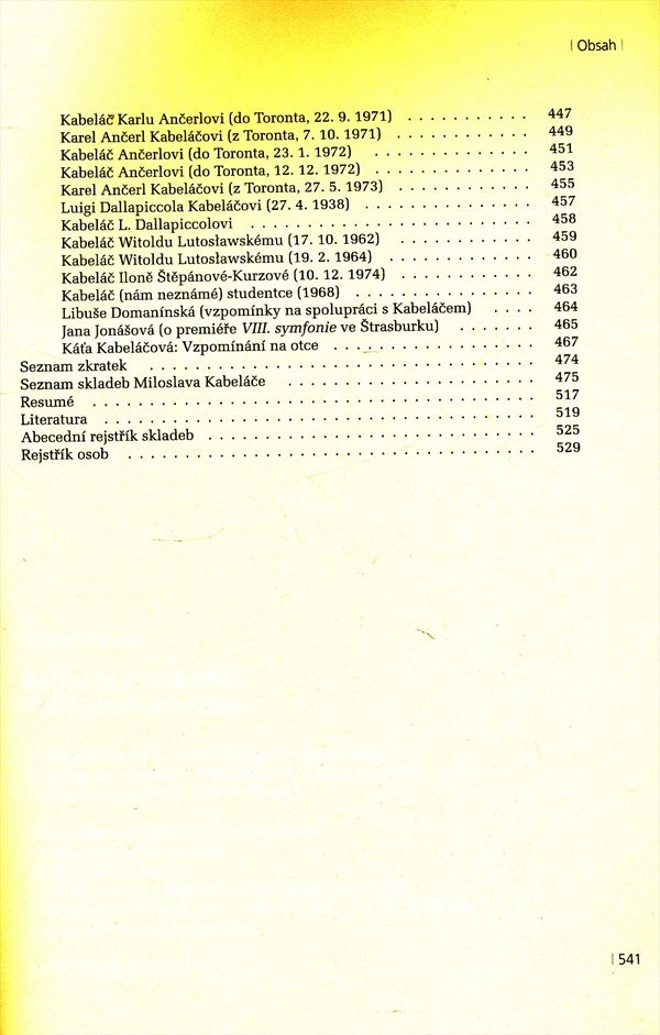 Po úvodních kapitolách o životě a formování osobnosti skladatele následují objevné kapitoly věnované otázkám stylu a Kabeláčově kompoziční technice. Zásadní informace obsahují rovněž kapitoly s přetištěnou korespondencí, jejímiž adresáty byli např. Karel Ančerl a W. Lutoslawský, Kabeláčovy vlastní odborné texty o skladatelích a interpretech a četná interview. Notové ukázky vč. dosud nepublikovaných děl a fotografií v textu. Závěr publikace tvoří chronologicky uspořádaný kompletní seznam Kabeláčových skladeb, jejich abecedně řazený seznam, přehled skladeb podle druhu a obsazení, seznam literatury a rejstřík osob.