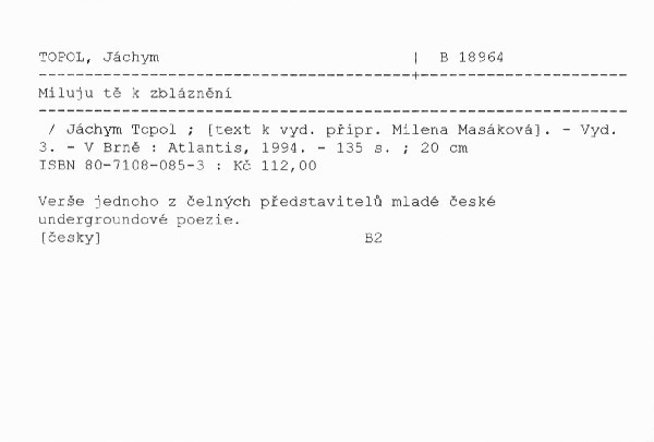 | Autor | Jáchym Topol ; [text k vyd. připr. Milena Masáková] |