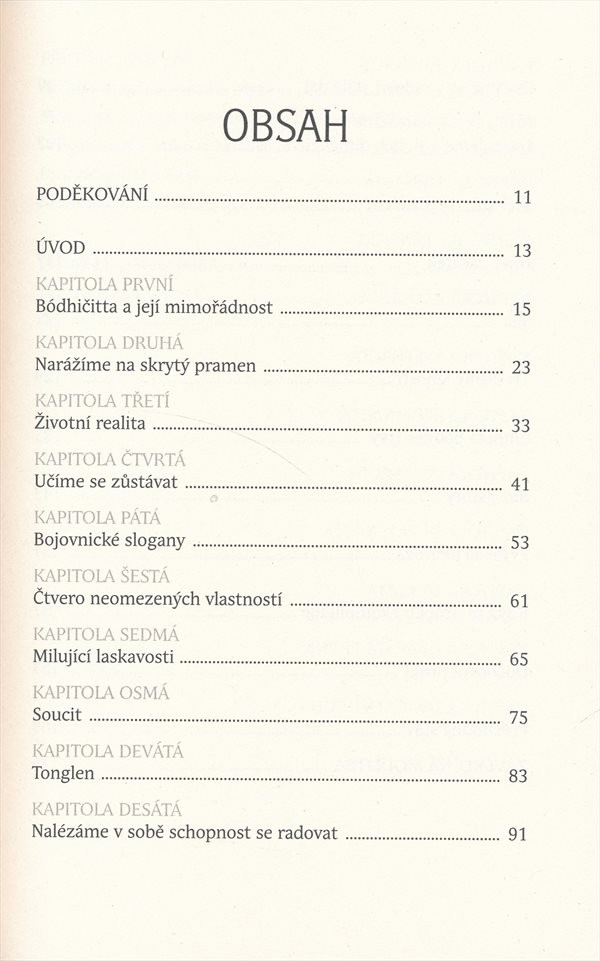 V této knize nám Pema Chödrön poskytuje nástroje, s jejichž pomocí lze zvládat obtíže, které život člověku staví do cesty. Ukazuje, jak v sobě probudit základní dobro a spojit se s ostatními, abychom přijali sami sebe i druhé včetně našich nedostatků a abychom setrvali v přítomném okamžiku tím, že prohlédneme všechny strategie našeho ega, které má na svědomí to, že odporujeme životu tady a teď. Utrpení je v lidském životě nevyhnutelné, není však bezpodmínečně nutné se jím nechat ničit. K tomu, jak se s ním vyrovnávat, nám může překvapivě napomoci, když zapomeneme na sebe a budeme v maximální možné míře rozvíjet soucit s druhými. Nakladatelská anotace. Kráceno.