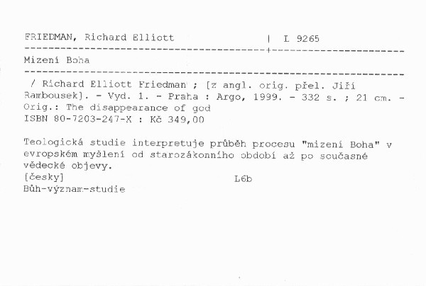 | Autor | Richard Elliott Friedman ; [z angl. orig. přel. Jiří Rambousek] |
