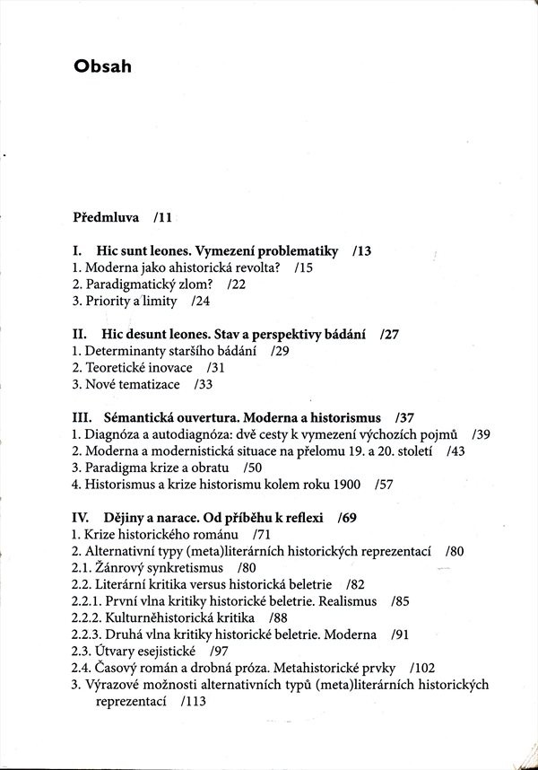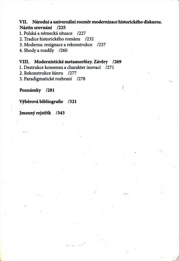 Předmětem této literárněhistorické studie je krize historismu, včetně logického nástupu moderny na rozhraní 19. a 20. století. Autorka zkoumá tuto problematiku velmi detailně na praktických příkladech. Součástí publikace je hutný poznámkový aparát, včetně jmenného rejstříku.
