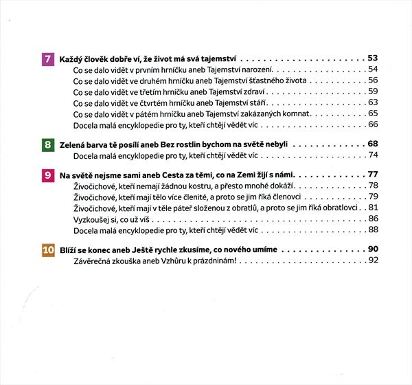 Publikace seznamuje na svých stránkách se zákonitostmi přírody a krajiny, s historií země, čtenáři zabrousí do živočišné i rostlinné říše, seznámí se s dějinami lidské civilizace od pravěku po současnost, najdou odpověď na všetečné otázky týkající se základních fyzikálních zákonů, vesmíru, biologie lidského těla i záludnostmi naší psychiky. Kniha je určena všem začínajícím školákům, kteří se chtějí dozvědět více, než ve škole... Nakladatelská anotace. Kráceno.