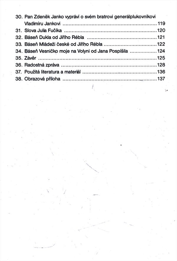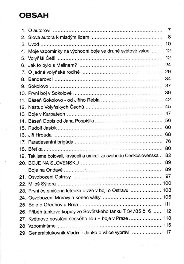 Autor, jenž působil jako telegrafista čs. jednotky v Sovětském svazu, líčí průběh význačných bojových operací na východní frontě (bitva u Sokolova, karpatsko-dukelská operace, osvobozování Československa - boje na slovenském území, osvobozování Moravy i konec války v květnu 1945). Připomíná podíl volyňských Čechů na bojových operacích, jejich hrdinství a ochotu bojovat za svou původní vlast. Knížka obsahuje i údaje o dějinách Čechů na Volyni a informace o autorových předcích. Text doplňují černobílé dokumentární fotografie.