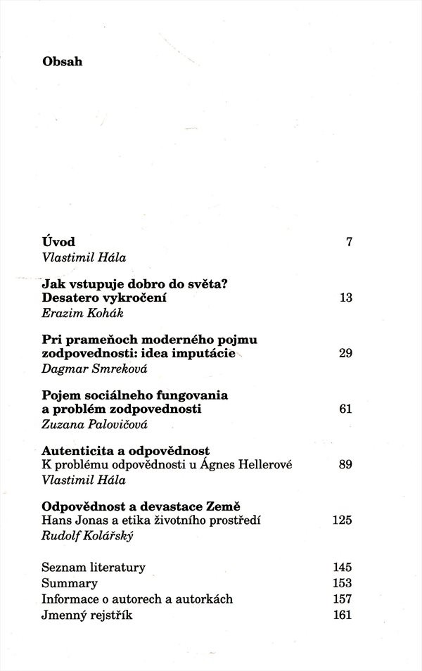 Podle autorů je v dnešním globalizovaném světě znejasněn vztah mezi lidským jednáním a jeho následky, což může vést k rezignaci na odpovědnost. Úvodní esej se zabývá obecným kontextem odpovědnosti z hlediska ontologie a fenomenologie. Další pojednání se věnuje zdrojům moderního pojetí odpovědnosti u M. Webera a u filozofů A. Giulianiho a P. Ricouera. Třetí se zaměřuje na zodpovědnost pojatou z hlediska sociálního fungování u ekonomů H. M. Bartlettové a A. Sena, a u filozofek M. C. Nussbaumové a E. S. Andersonové. Poslední 2 eseje se zabývají pojetím autenticity a odpovědnosti u filozofky Á. Hellerové a etikou životního prostředí u filozofa H. Jonase.