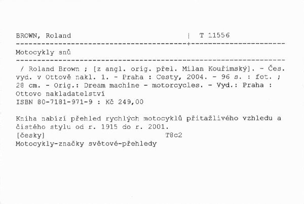 Kniha nabízí přehled rychlých motocyklů přitažlivého vzhledu a čistého stylu od r. 1915 do r. 2001.
