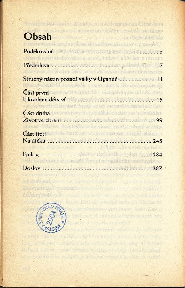 Malá ugandská holčička prožila prvních deset let ve své rodině bez lásky a za neustálého fyzického trestání a týrání. V zoufalství zvolila útěk z domova a shodou okolností se dostala do vzbouřenecké armády, která vedla v Ugandě občanskou válku. Jako dětský voják se s mnoha podobnými dětmi musela účastnit řady bojů a zabíjení a prožila další týrání, zneužívání a šikanování. Po mnoha prožitých hrůzách se jí s pomocí Komise pro uprchlíky OSN podařilo dostat do Dánska, kde nyní žije. Jako součást psychoterapie vznikla tato kniha, v níž líčí přestálá utrpení a ponižování.
