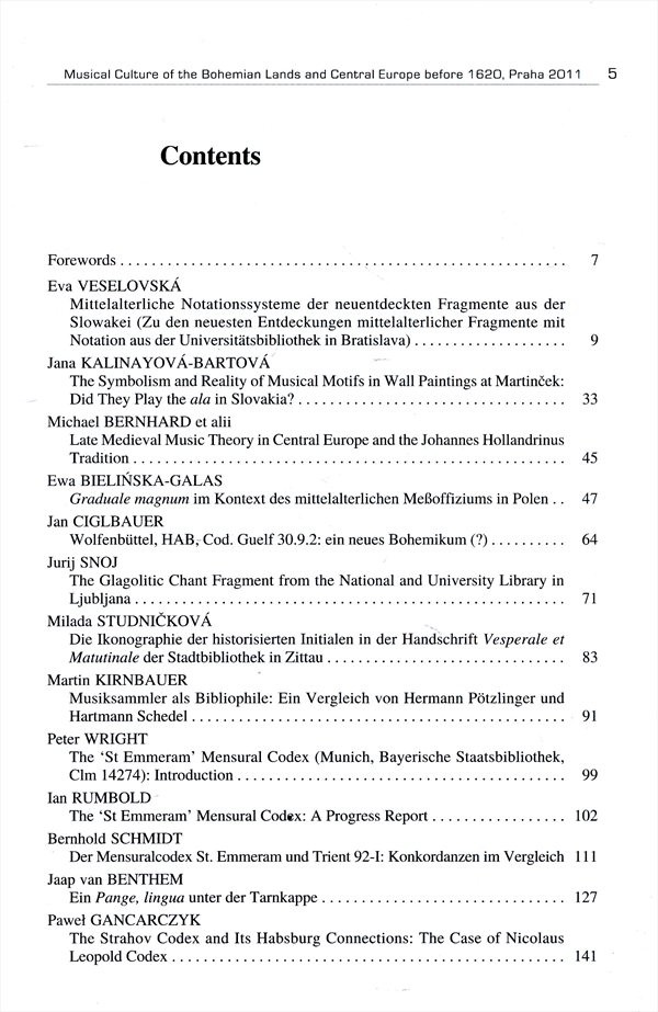 Publikace z ediční řady Clavis monumentorum musicorum Regni Bohemiae obsahuje 28 příspěvků současných českých i zahraničních badatelů v oblasti středověké a rané novověké hudby. Zásadní podíl představují vybrané kompletní prameny nebo jejich fragmenty a jejich srovnávací historická a hudební analýza s důrazem na kontexty s kulturním prostředím českých zemí. Tematicky se příspěvky pohybují v širším spektru a pokrývají časově ohraničené období celého středověku a počátku novověku do prvních desetiletí 17. století. Výběrově se jedná o studie s popisem pramenů s jednohlasým i vícehlasým vokálním repertoárem české a moravské provenience s přesahy do některých evropských regionů a o analýzy dobových skladebných technik, ale také o obecnější pojednání ke společensko kulturním kontextům počátků literátských bratrstev na Moravě, působení Jednoty bratrské a šíření její kancionálové produkce, o speciálních tabulaturních knihách, renesančních pramenech foliového formátu a mnohá další témata. Sborník je doplněn o soupis zmiňovaných pramenů a textových incipitů probíraného hudebního repertoáru.