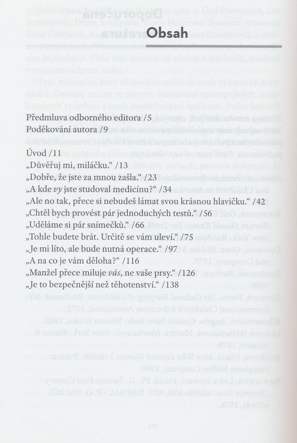 Na množství konkrétních případů tato kniha ukazuje, jakým způsobem se člověk může efektivně bránit lékařské a farmaceutické mašinérii, ať už jde o automatické chirurgické zákroky, invazivní těhotenské testy či průběh porodu a seznamuje s nejběžnějšími riziky spjatými s lékařskými postupy užívaných na ženách. Nakladatelská anotace. Kráceno.