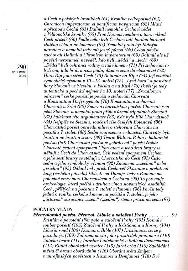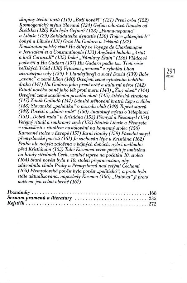 Studie srovnávají mytologickou látku z hlediska jejího společného indoevropského původu. Autor rozebírá základní české mýty, na jejichž základě se formovaly tradice, kulturní dějiny a identita národa. Jednotlivé studie jsou věnovány slovanské variantě indoevropského mýtu o stvoření světa, pověsti o příchodu Čechů a přemyslovským pověstem. Vycházejí zejména z rozboru nejstarších českých kronik (Kosmas, Kristian) a hledají modely, "prapodoby" či archetypy těchto pověstí.
