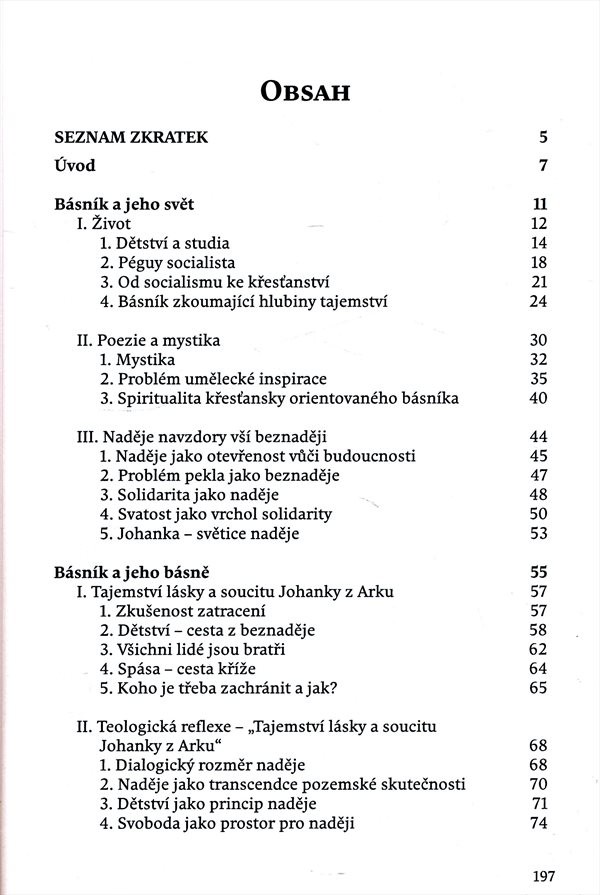 Otázka naděje v Péguyho díle je zde chápána jako básníkovo klíčové téma, a proto se autor rozhodl blíže o něm pojednat. Metodicky vychází ze sledování tématu nejprve v básníkově životě a jeho myšlenkovém světě a poté v jeho díle básnickém. Zaměřil se především na Péguyho básnické spisy, které v chronologickém pořadí na sebe tématicky navazují a jedno tématicky předpokládá druhé. Nakladatelská anotace.