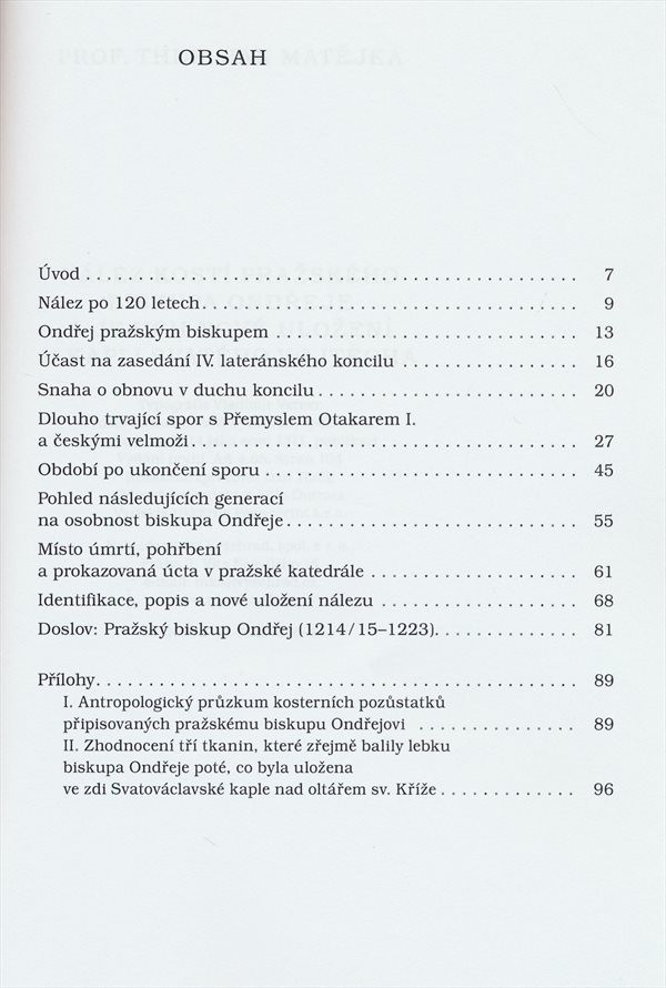 Ostatky pražského biskupa Ondřeje byly nalezeny dne 17. 9. 2008 v Manderscheidské knihovně pražského arcibiskupského paláce a následně porovnány se zprávou o nálezu kostí objevených během stavebních prací v roce 1888 ve zdi kaple sv. Václava v katedrále sv. Víta. Po zjištění, že se jedná o kosterní pozůstatky biskupa Ondřeje, byly ve skleněné schráně nově uloženy v kapli sv. Vojtěcha v katedrále sv. Víta. V úvodu se studie zabývá postavou biskupa Ondřeje a jeho účastí na zasedání IV. lateránského koncilu, kde přijal biskupské svěcení, zmiňuje také jeho dlouhotrvajcí spor s Přemyslem Otakarem I. a českými velmoži. Součástí publikace jsou dvě přílohy, jedna pojednává o antropologickém průzkumu kostí připisovaných biskupu Ondřejovi, druhá hodnotí tkaniny, do kterých byla zabalena lebka biskupa před uložením do zdi Svatováclavské kaple nad oltářem sv. Kříže.